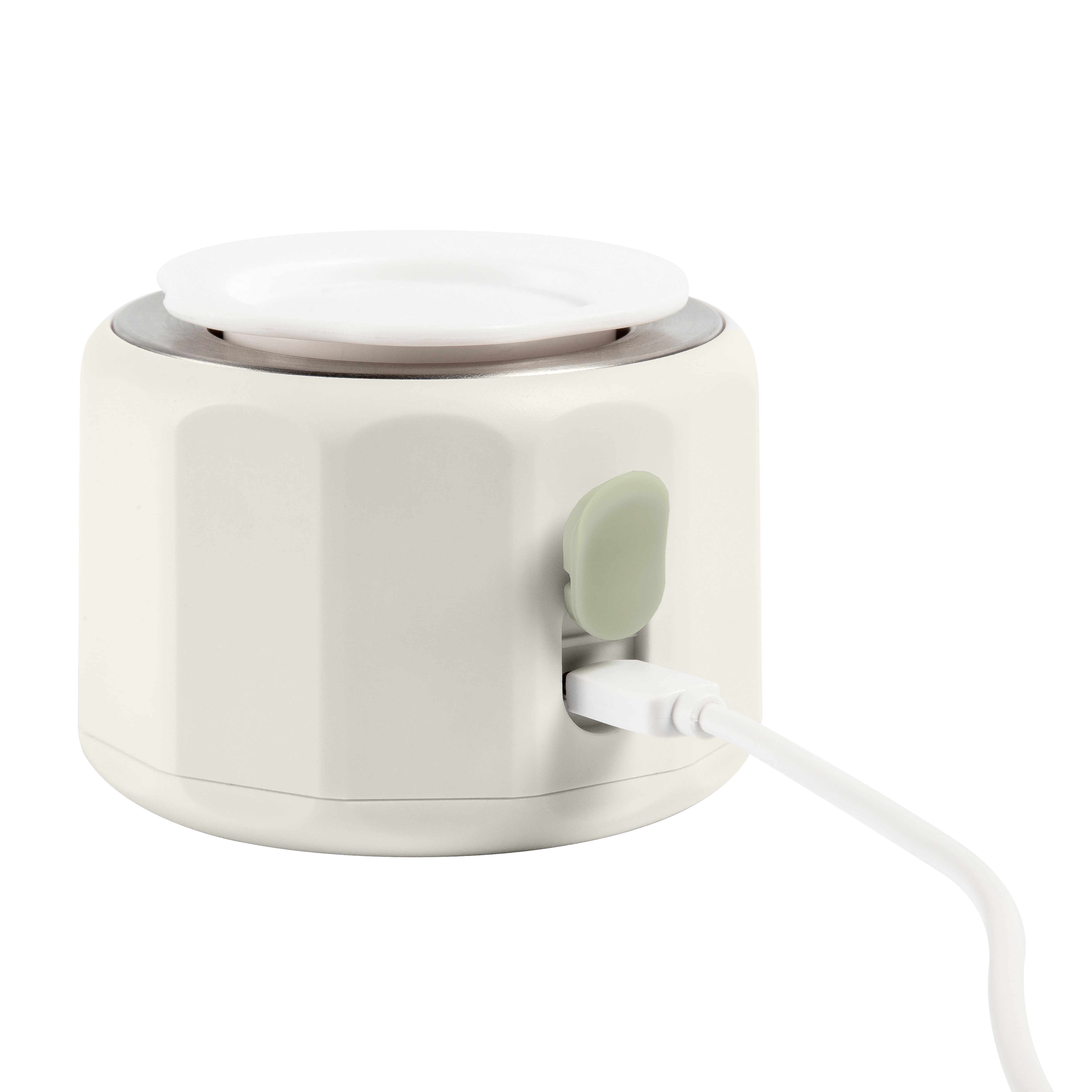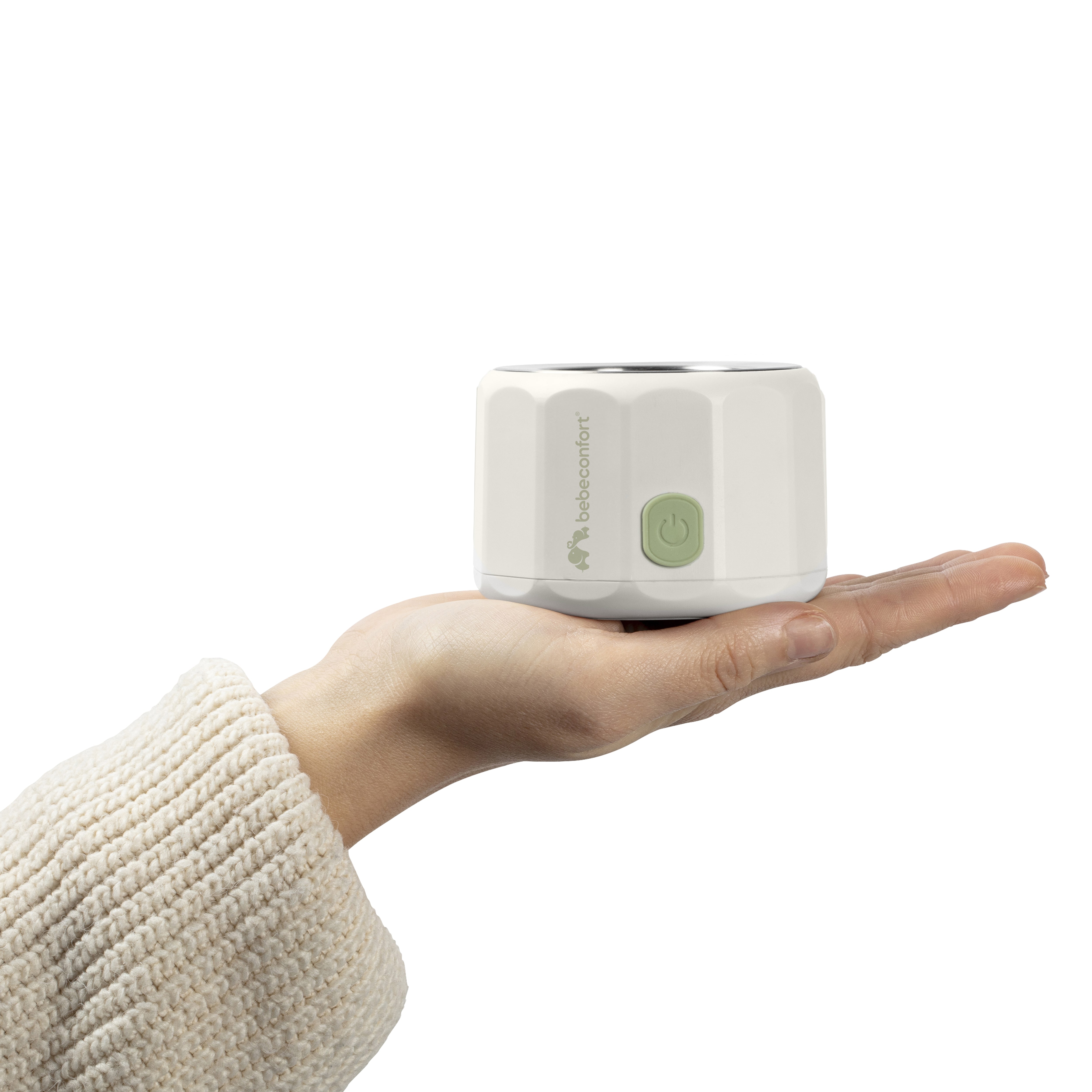 The Pocket bottle warmer works with a lithium rechargeable battery and a warming plate. Put the bottle warmer upside down and simply screw your bottle, filled with water or breastmilk, directly onto it, turn the device back on its base and on a flat surface, and press the on button to start the warming cycle. You can warm up baby’s milk anywhere without the need for a socket.